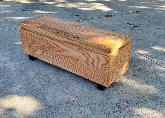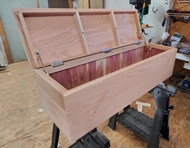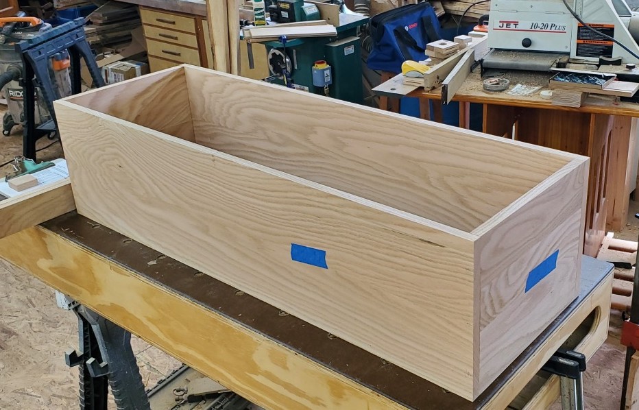 Since the last update, I moved on to the lid and internal details of the case. The first additions to the raw case were a few strips surrounding the upper rim where the lid will sit and the internal cedar lining will terminate. You can see those in place and clamped allowing the glue to dry below.