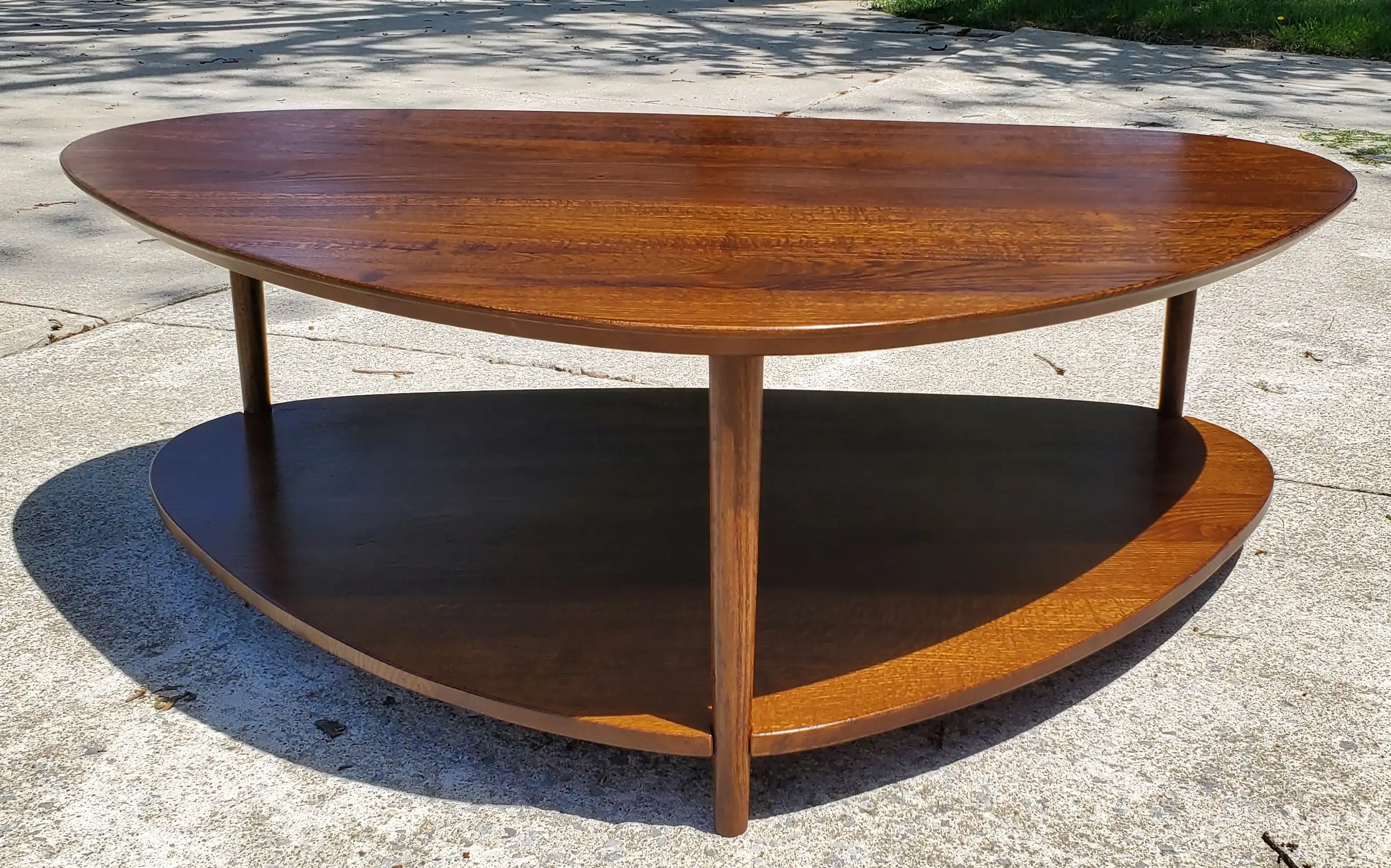 Since the last update, the final form of the table has taken shape. Starting with the blank panels that were glued up and ready for profiling, I used the template to mark the shape, then I cut the profile out from the larger panels. The bottom shelf was also cut to shape with a slightly smaller size taken from the top panel. From there, I was able to do a first initial sanding to clean up the panels.