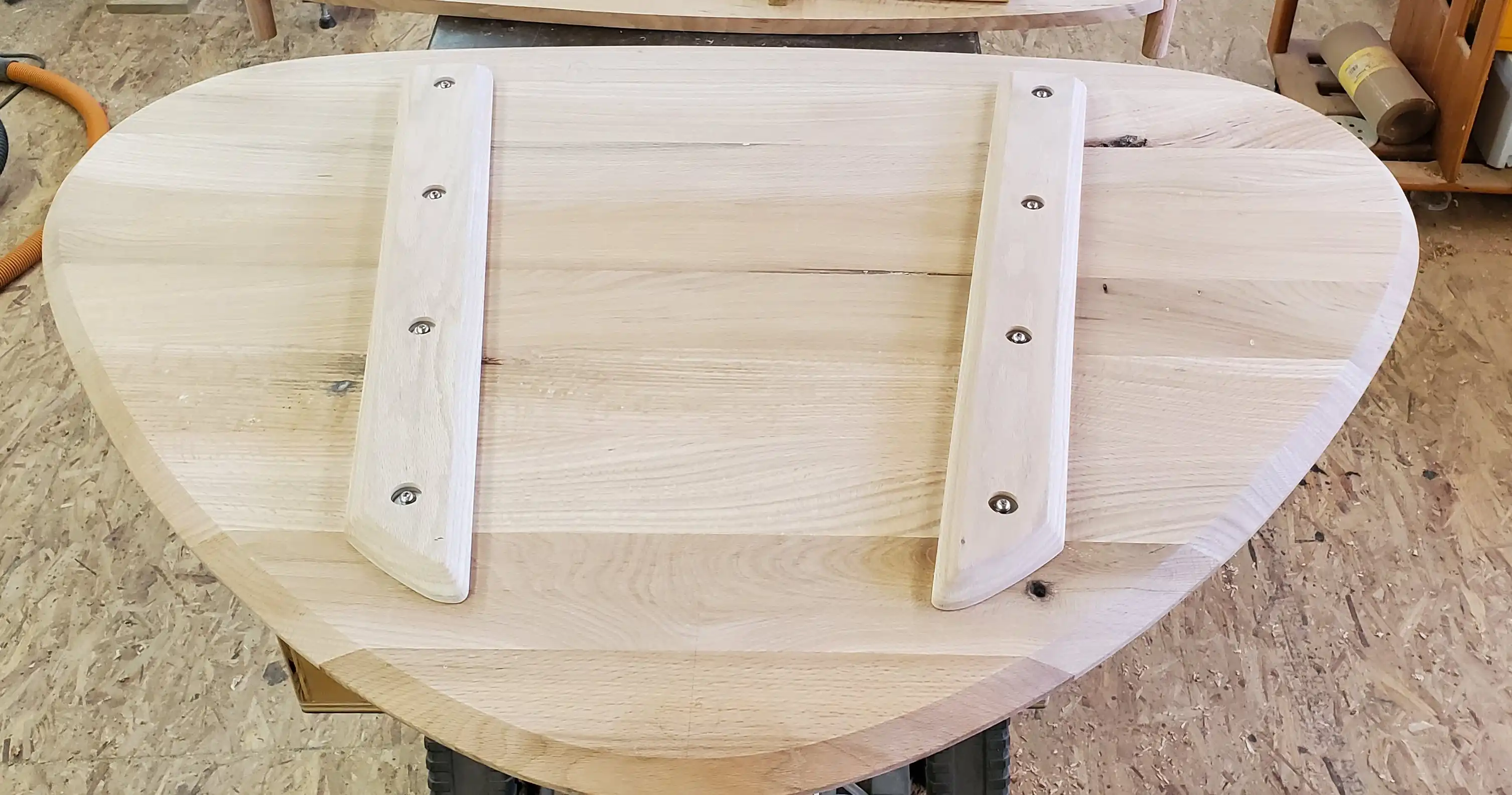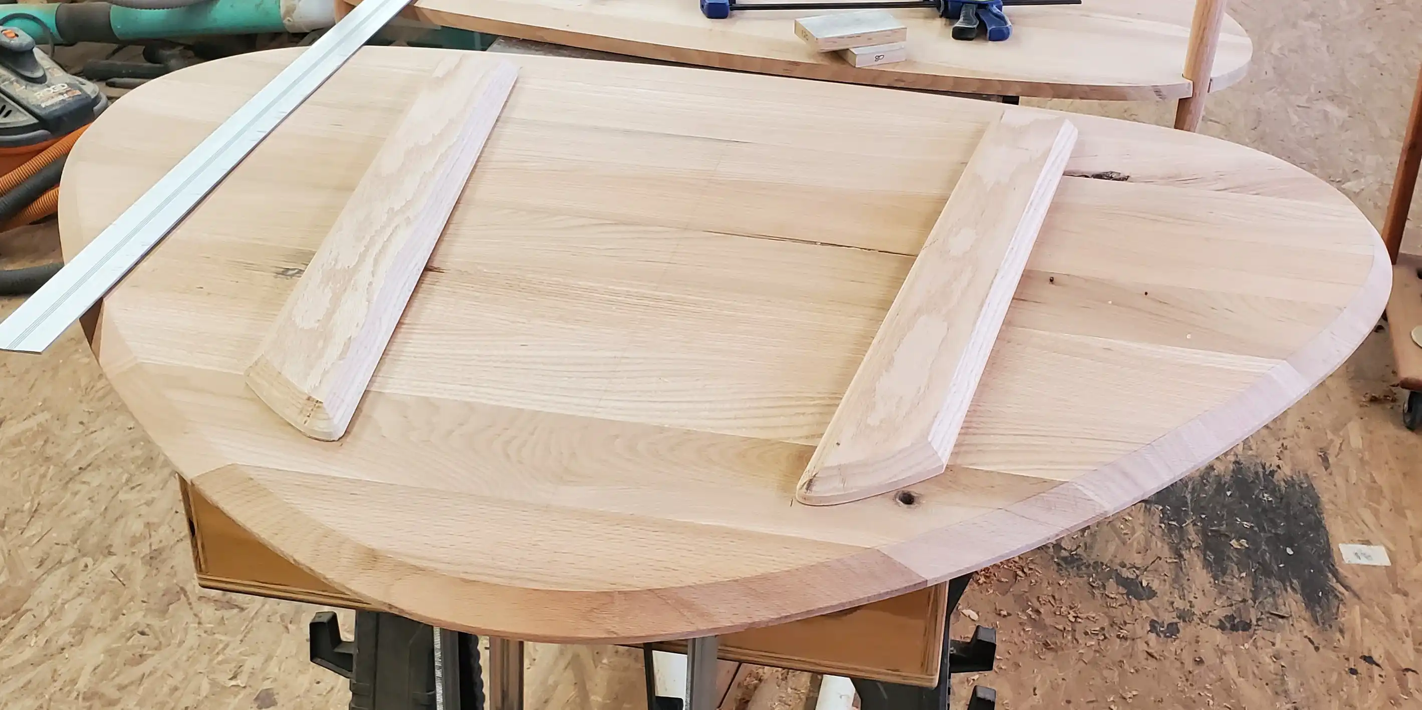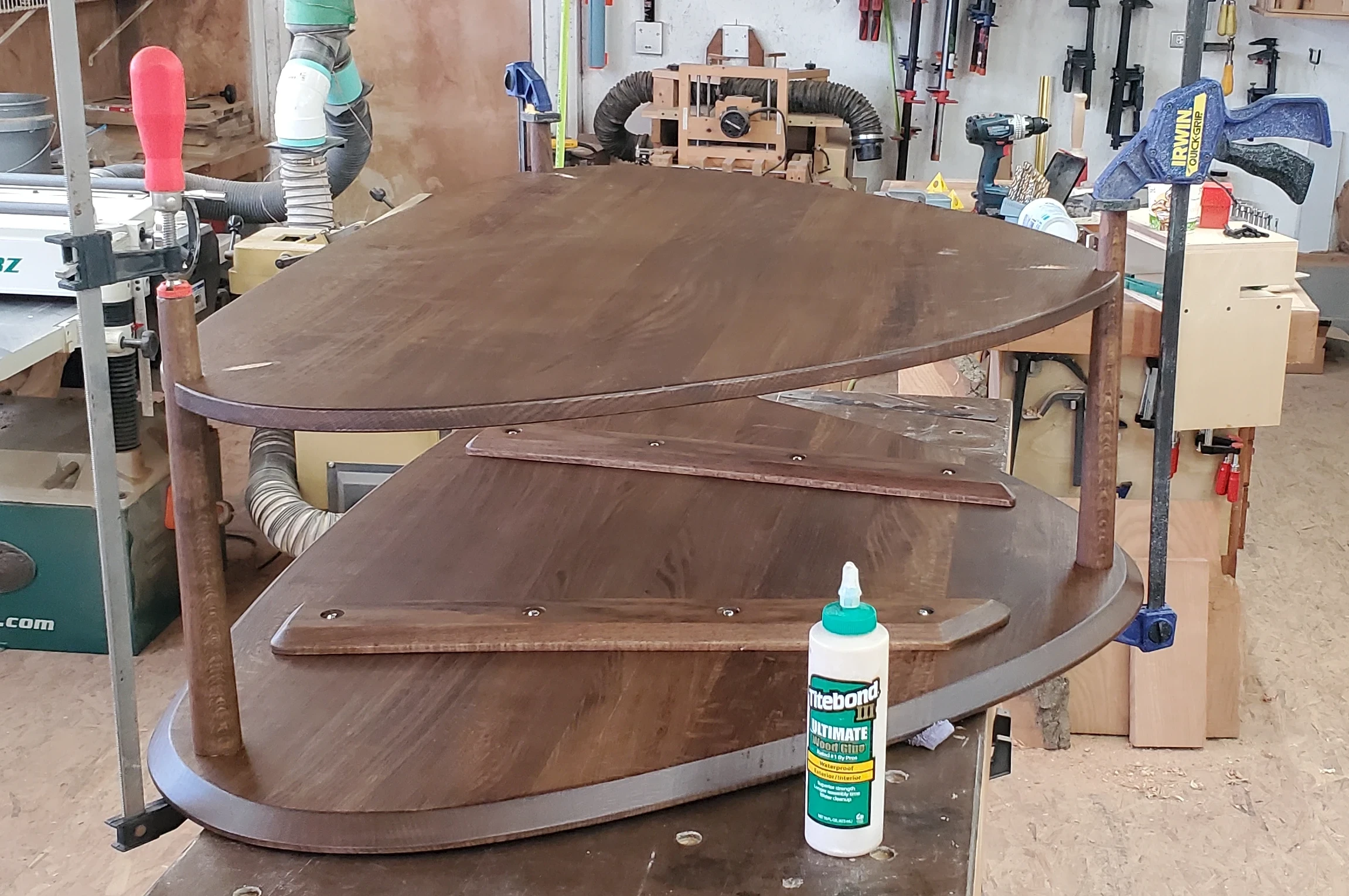 While I don’t suspect we will have any major warping or movement issues with this piece, I tend to take a “belt-and-suspenders” approach, especially when sending pieces to entirely different climates across the country! On the underside of the table top, I cut out some supports that will get screwed to help hold the panel flat over time. The edges were beveled and sized to prevent these pieces from being seen until you squat down or bend over near the table.
