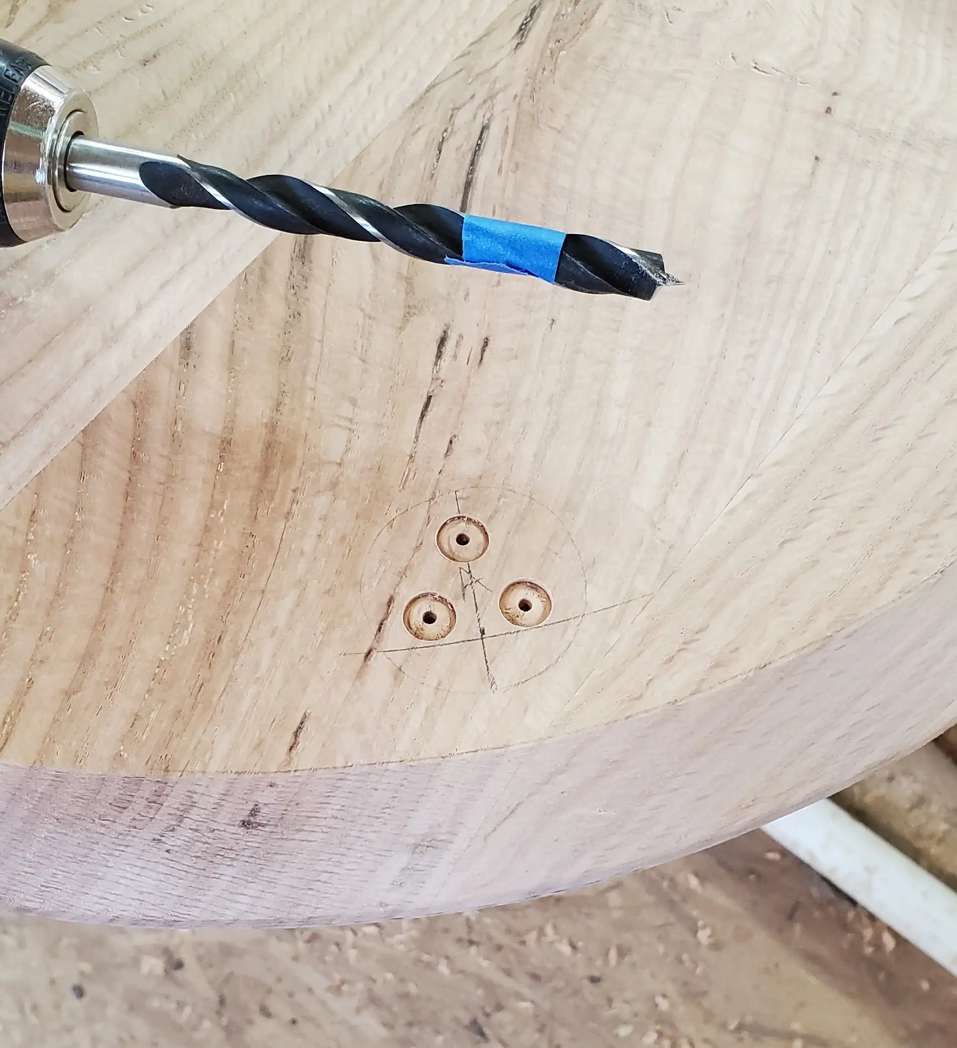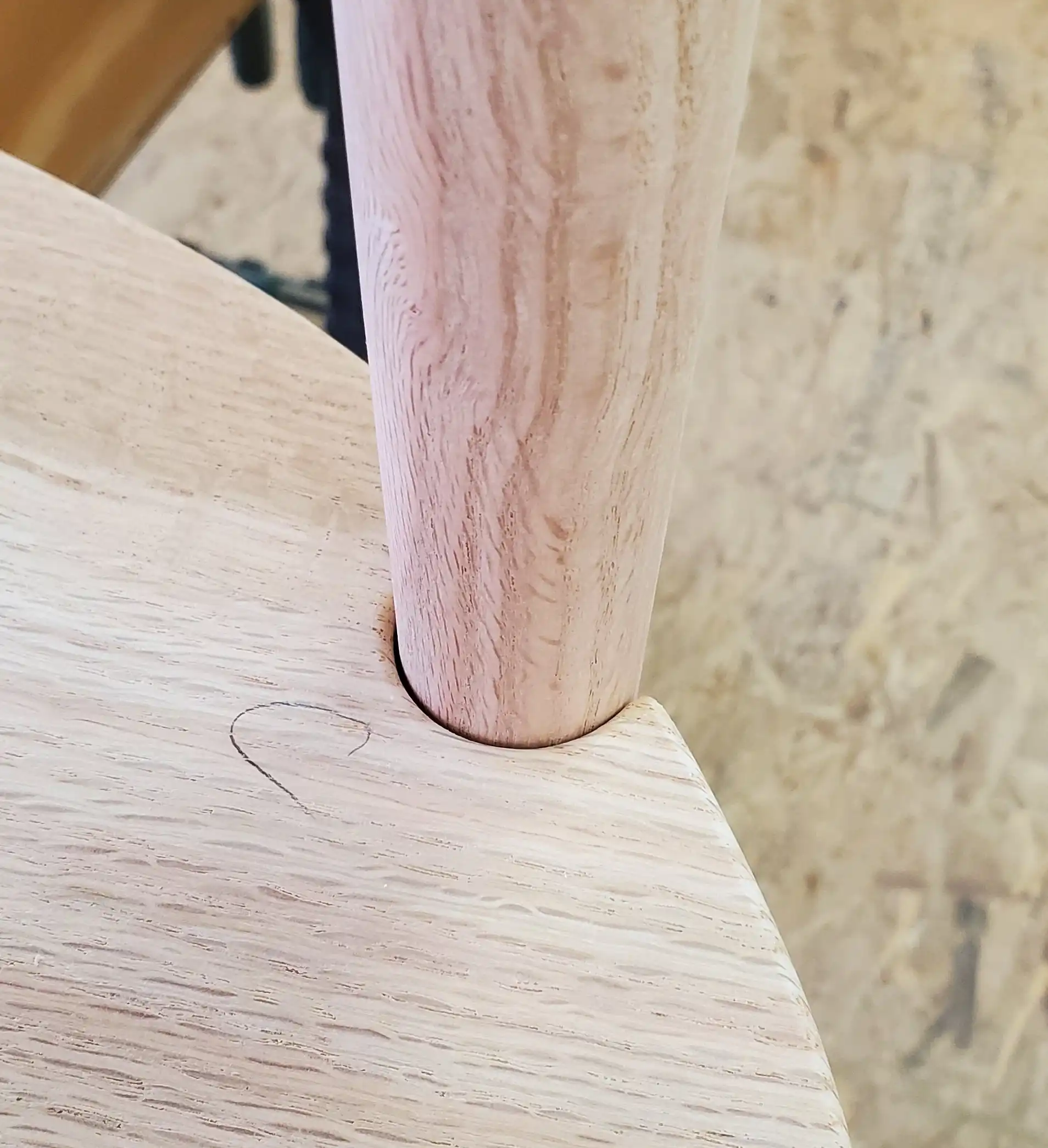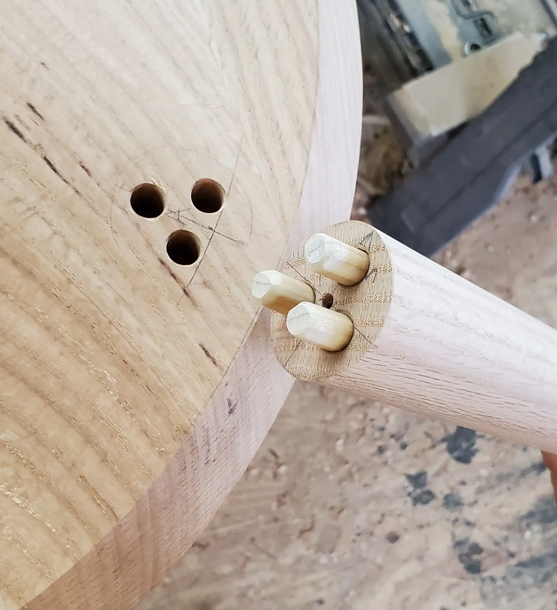 We then drill the holes into both the ends of the legs and the table top, cut the dowels to size, and do a quick test fit.