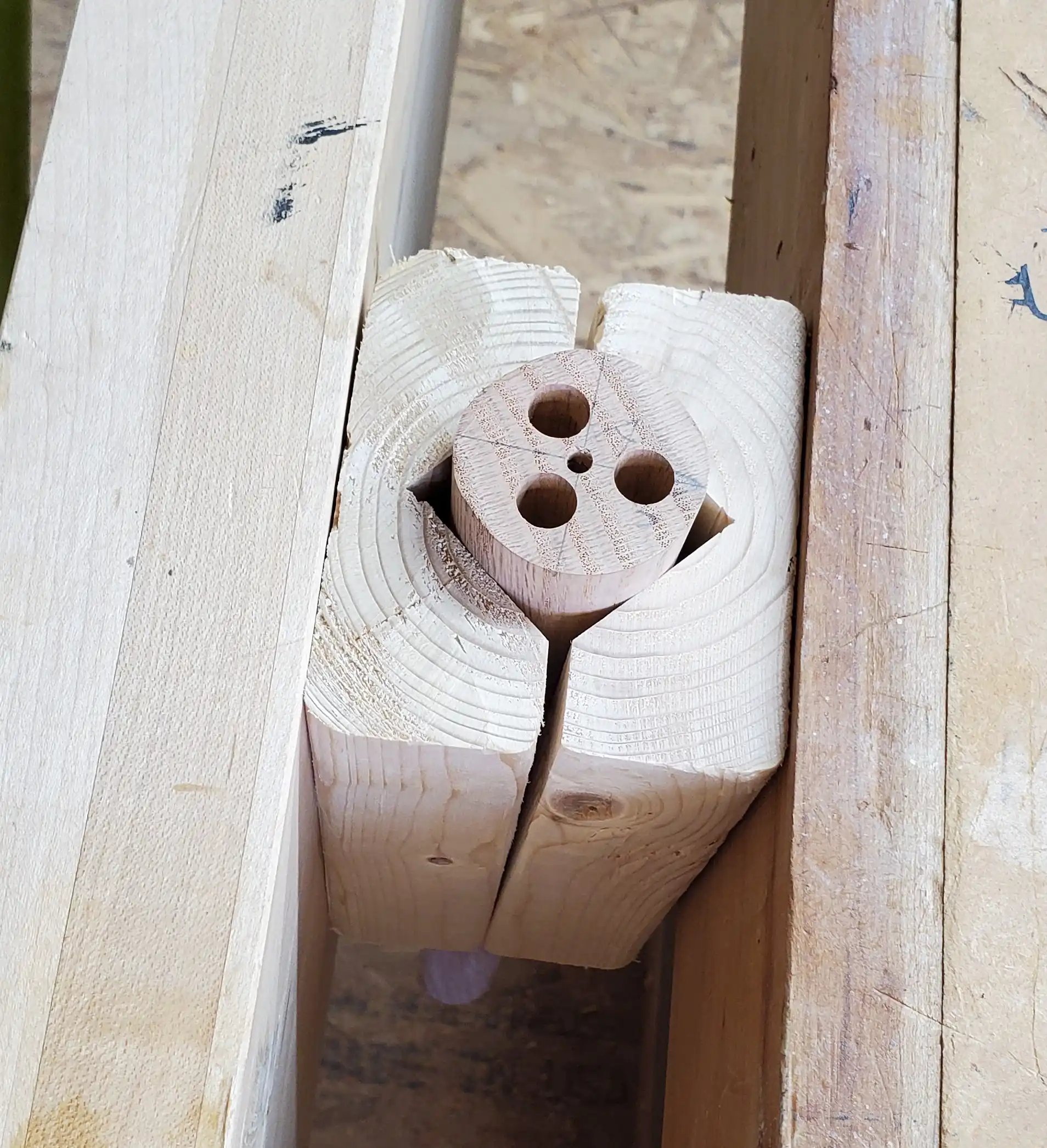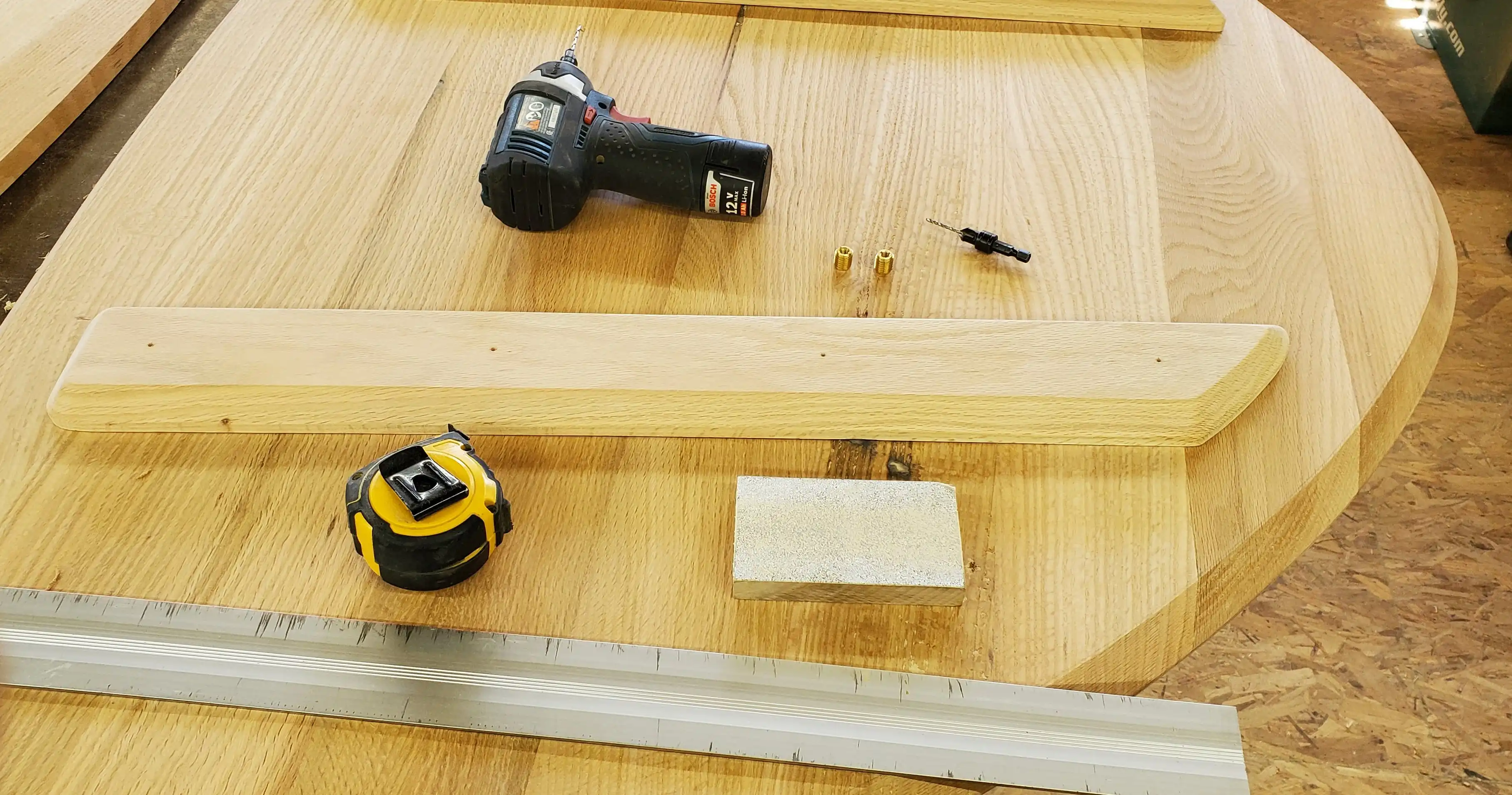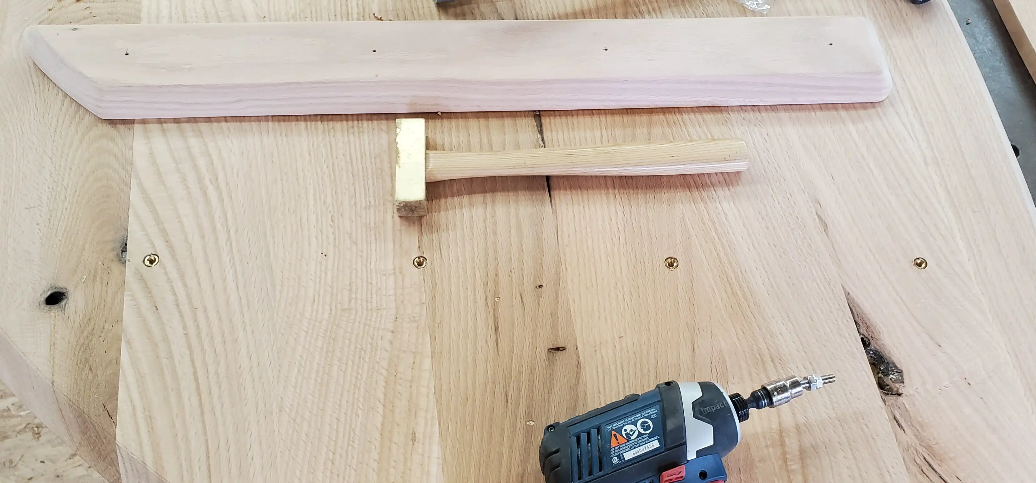We then drill the holes into both the ends of the legs and the table top, cut the dowels to size, and do a quick test fit.