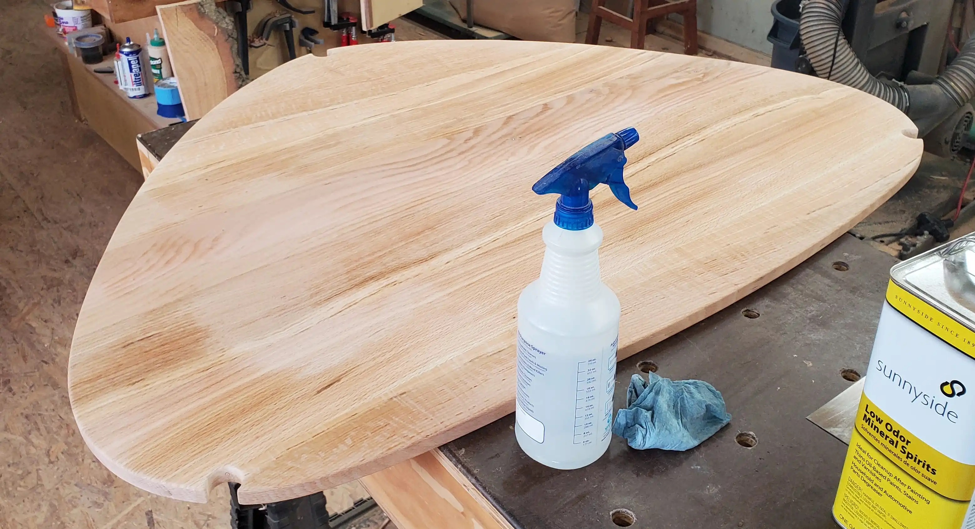 - Raise the grain. Since we are using water-based finishes, we pre-wet the surface with water so that the very surface wood grain swells creating a rough surface. We then lightly sand this back to smooth. This step makes sure that this swelling doesn’t happen once we apply the finish.