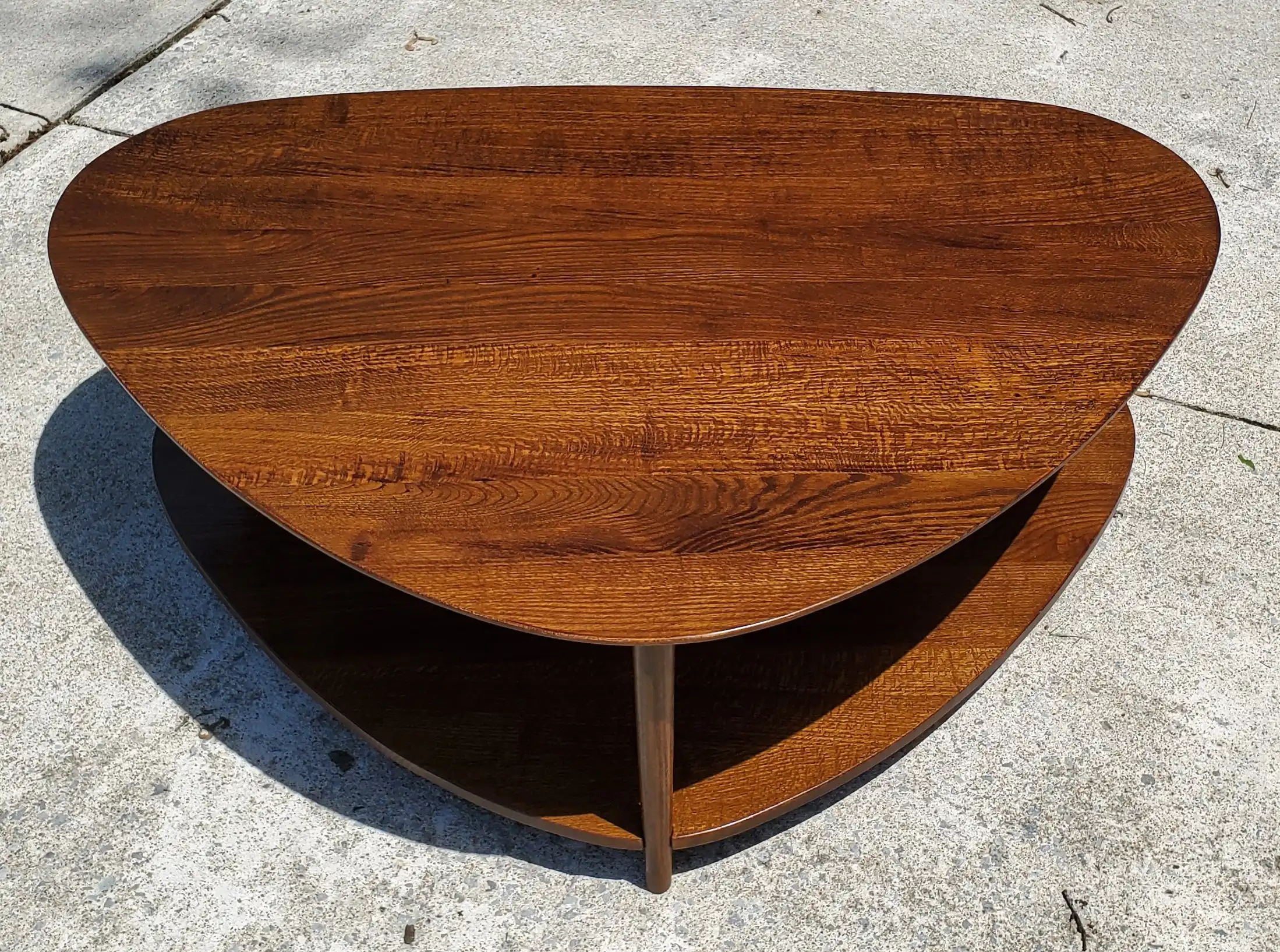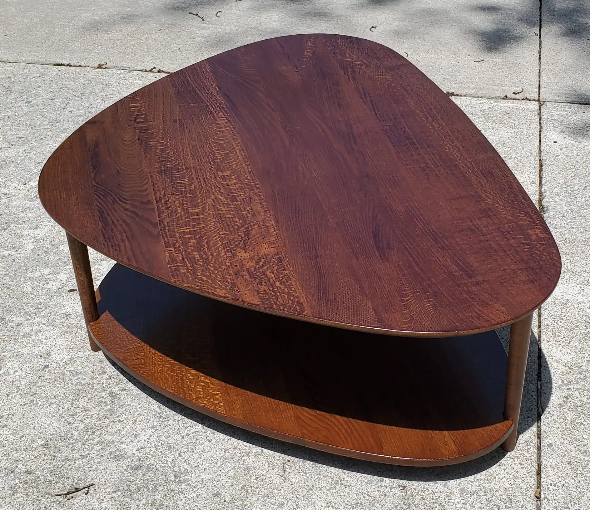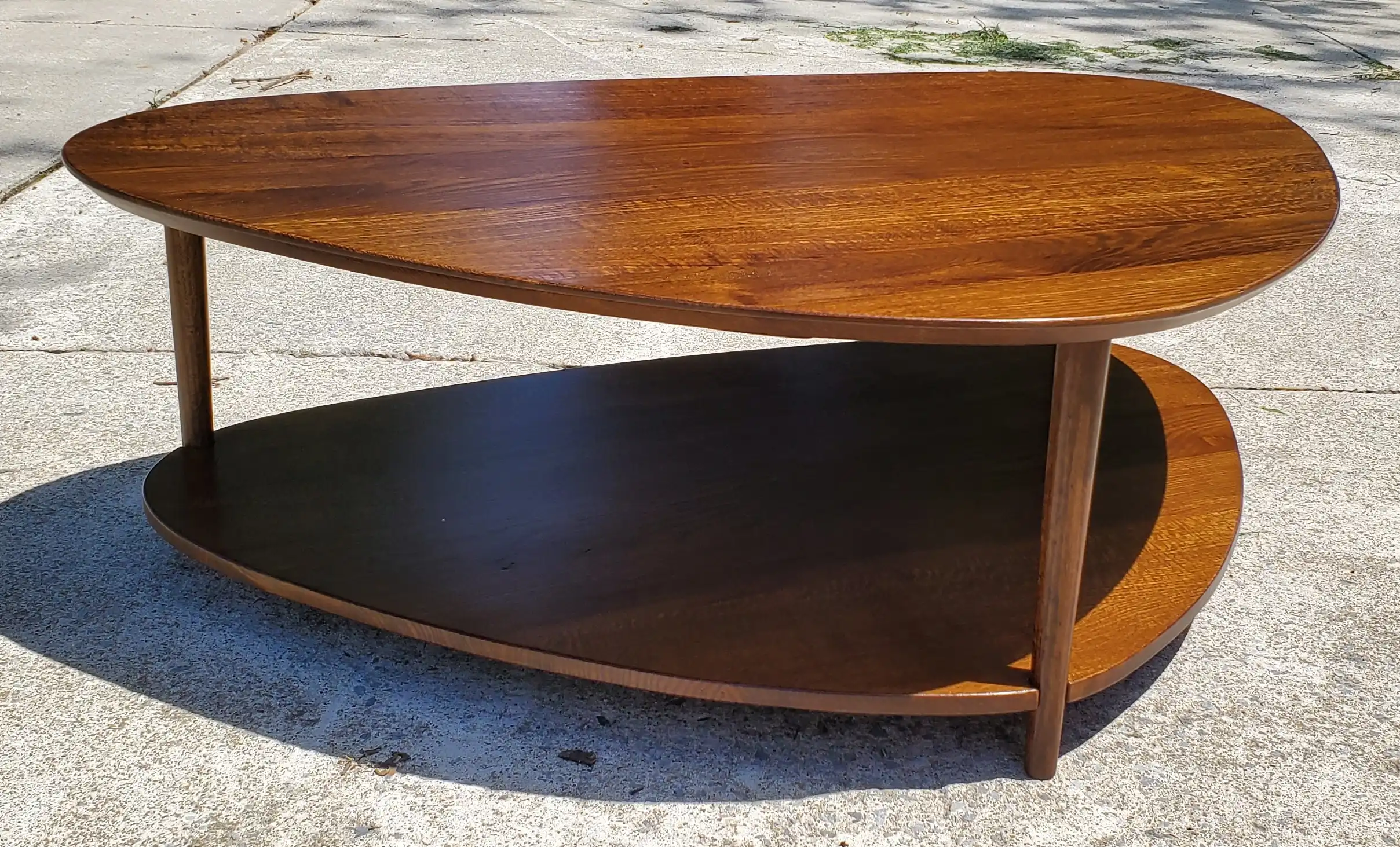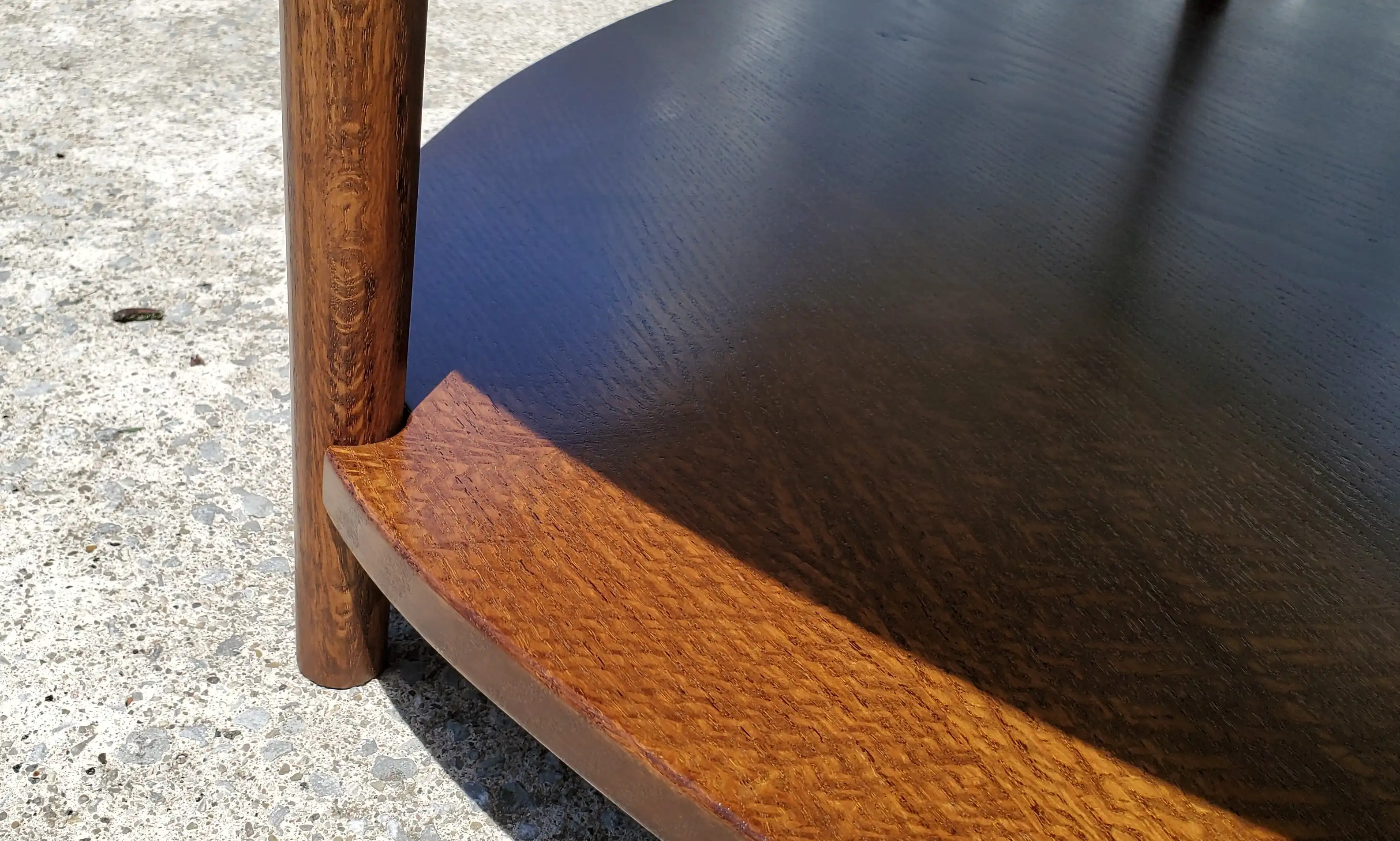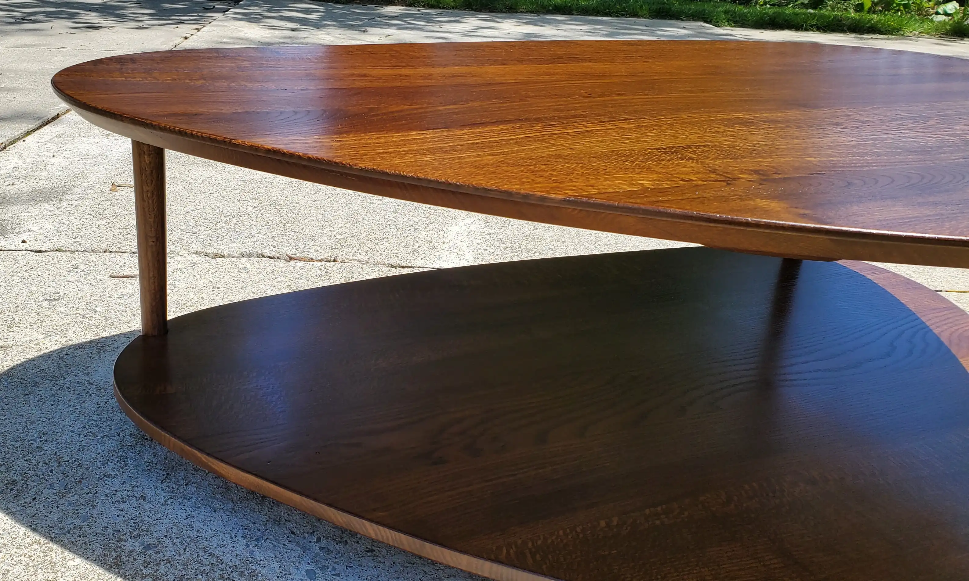 This step officially marks the end of the major woodworking. We now shift to the fine details. While the major top profiles are cut, it is time to sand over the sharp edges and blend the various contours added by our shaper in the previous update. For the bottom shelf, the notches cut to cradle the legs are cleaned-up with a small 1/8" radius roundover and some hand-sanding to get a clean relief when the shelf intersects the leg.