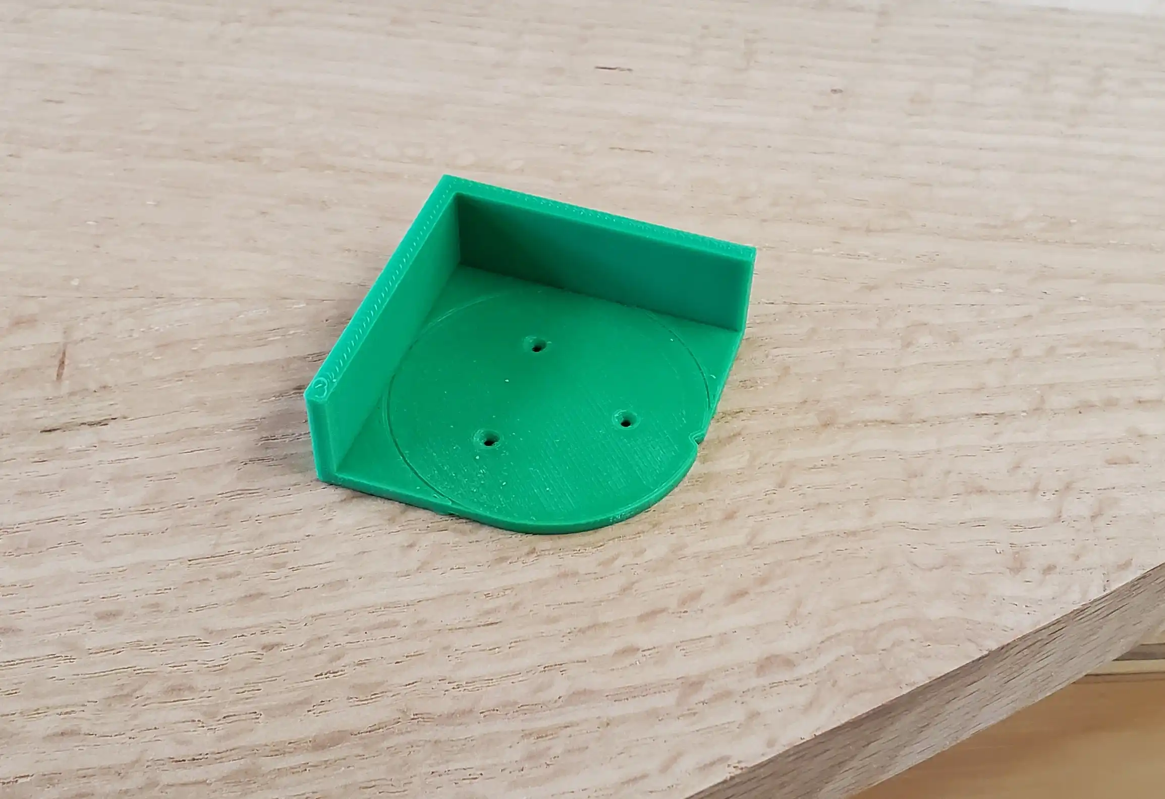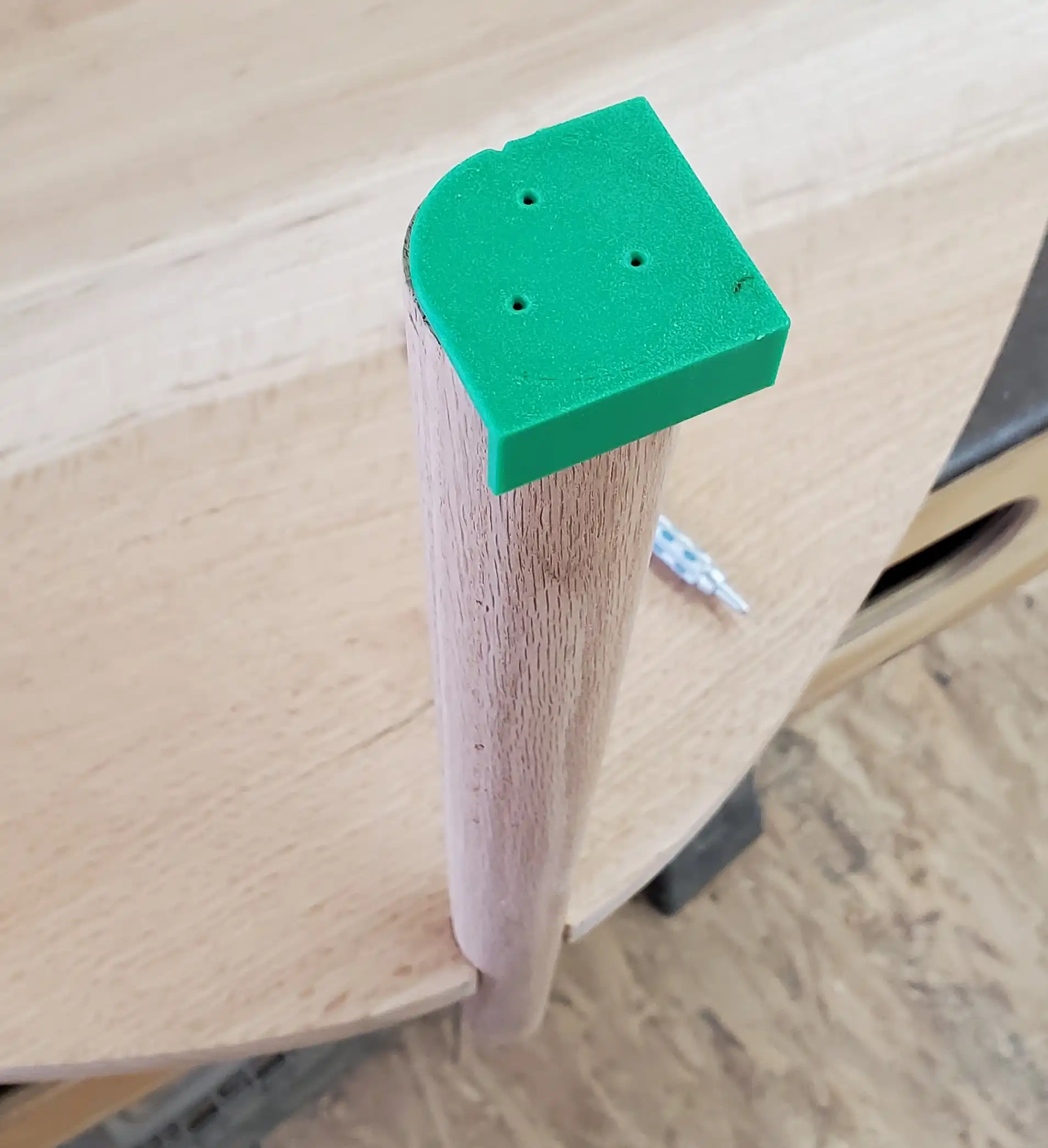 Next up, we begin focusing on attaching the legs to the table top. For this, a set of 3 dowels are used for the joinery to provide a large amount of glue surface to lock the legs into place. One difficulty is drilling the holes in a consistent pattern. For this, I turn to my 3D printer. I printed a quick jig out of plastic to mark out the hole locations.